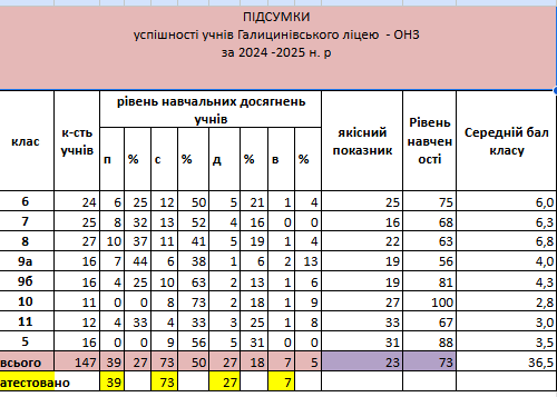 ПІДСУМКИ успішності учнів Галицинівського ліцею - ОНЗ за І семестр 2023 -2024 н. р. |